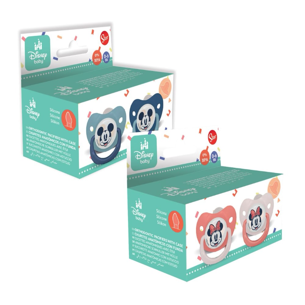 El Set de 2 chupetes Disney Baby Mickey & Minnie está diseñado para brindar confort y seguridad a tu bebé durante sus primeros meses. Su tetina anatómica de silicona se adapta perfectamente al paladar del bebé, favoreciendo un desarrollo bucal correcto y una succión natural y placentera.
