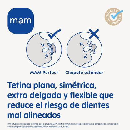 El chupete MAM Perfect 6 meses+ es un producto innovador diseñado para el cuidado bucal de los bebés. Su principal característica es su tetina ultrasuave y delgada, la cual minimiza la presión sobre la mandíbula y los dientes en desarrollo. Este chupete fue desarrollado en colaboración con ortodoncistas y odontólogos pediátricos, lo que garantiza su diseño ergonómico y seguro.
