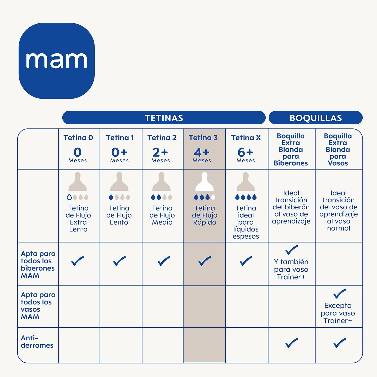 - FLUJO RÁPIDO: A partir de 4 meses; apta para todos los biberones MAM