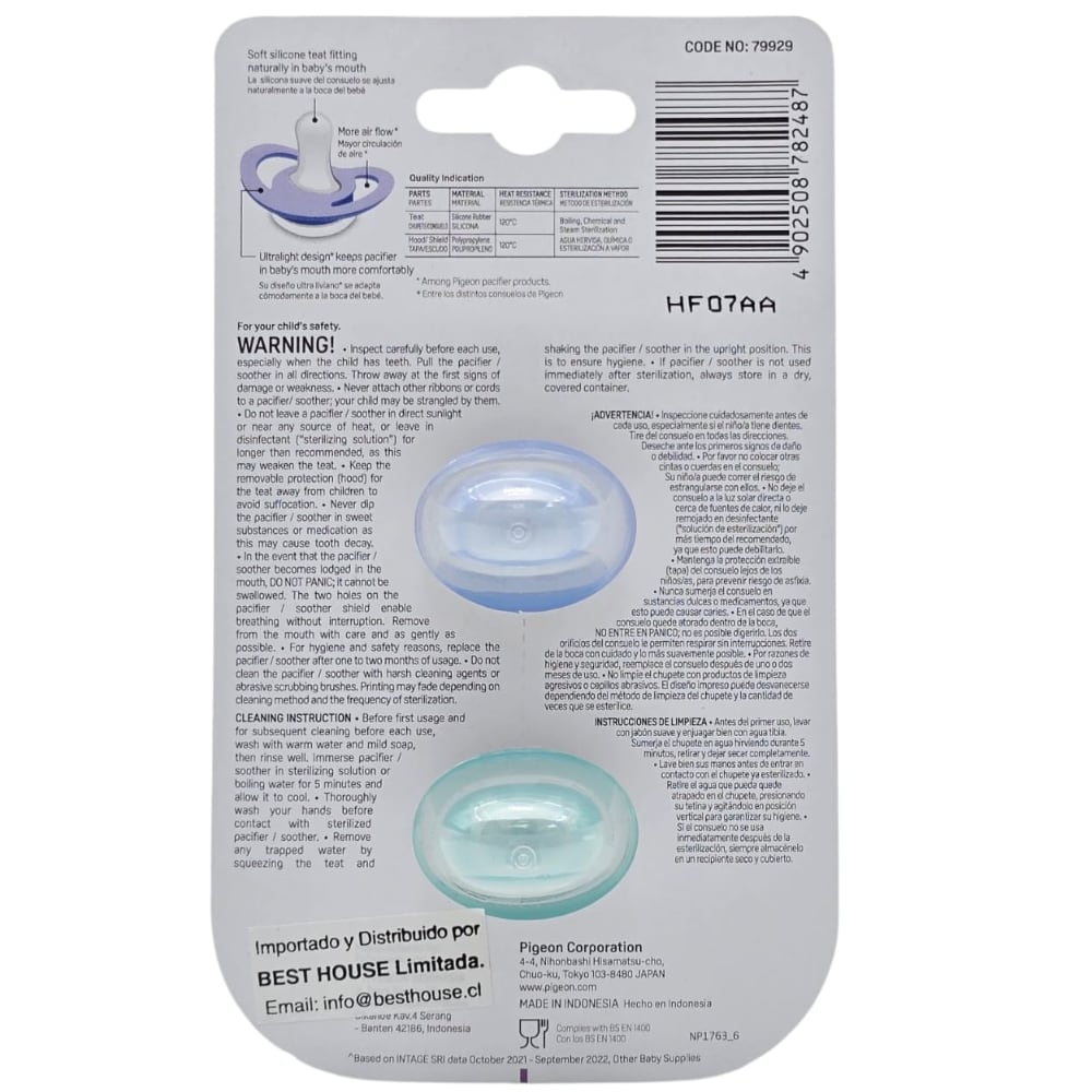 Los bebés tienen una necesidad natural de succionar. Los Chupetes Odontológico PIGEON Mini Light Talla L 12m+ satisfacen sus necesidades y calman sus emociones. Aparte de eso, los chupetes también ayudan a los bebés a aprender la respiración nasal. Los chupetes PIGEON están hechos de la clase más suave de silicona, con una forma que se adapta realmente a la boca del bebé.