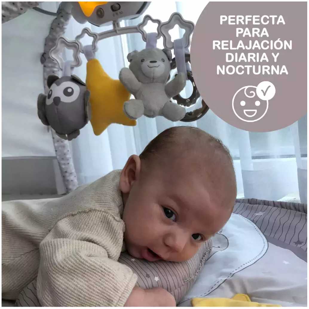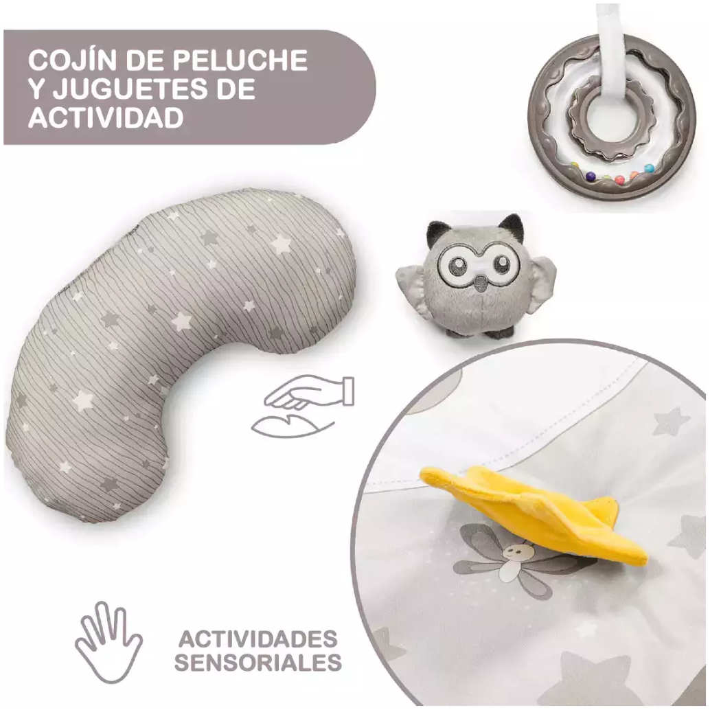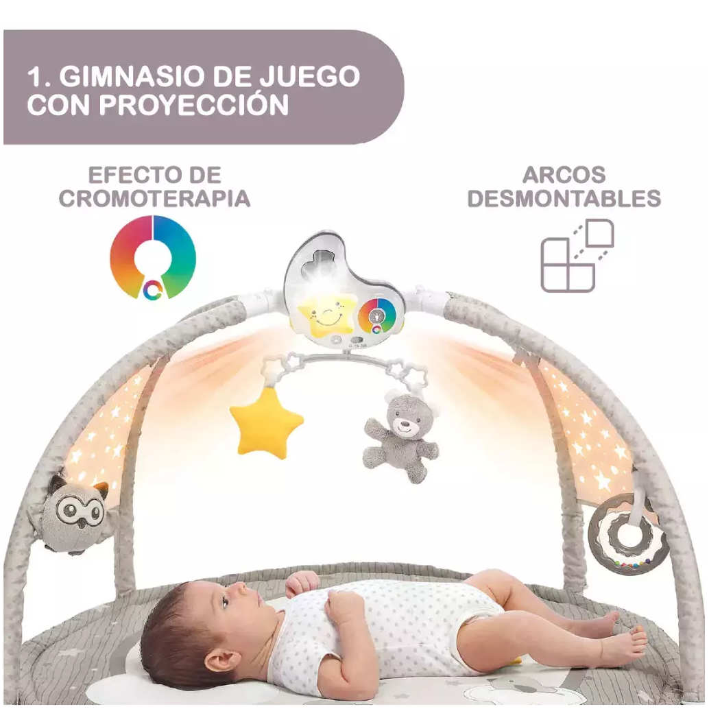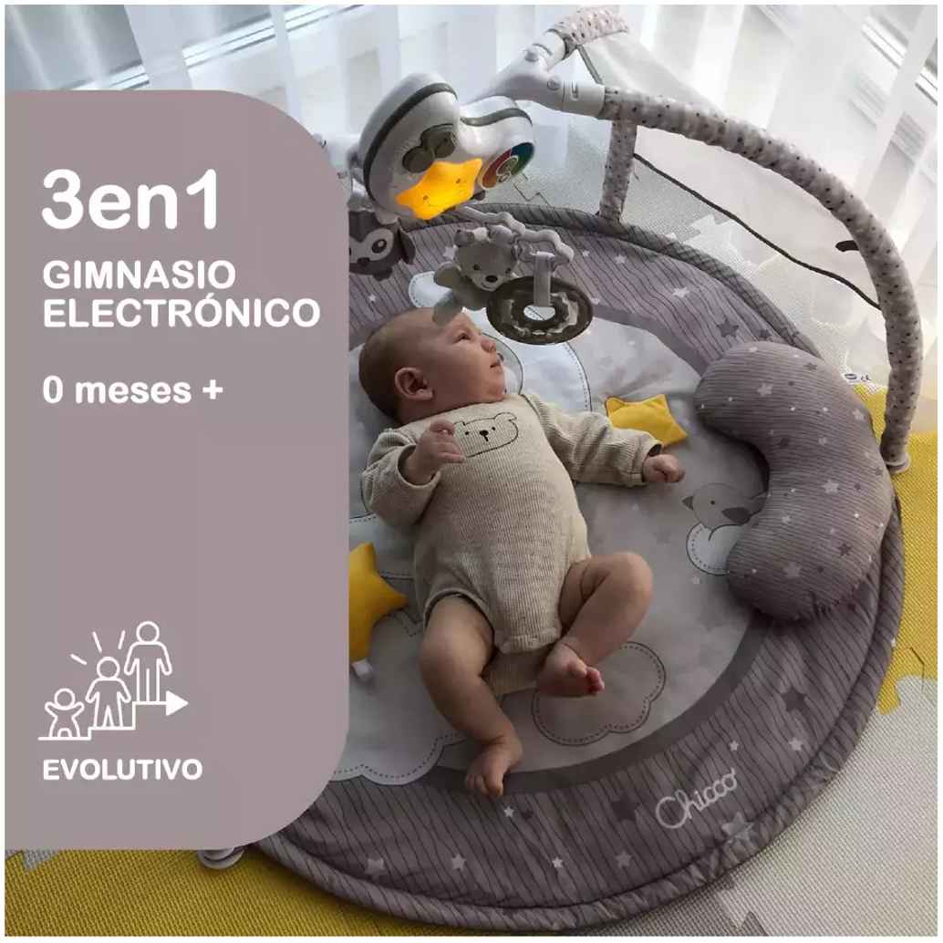 - Noche y día: el gimnasio de actividades de Chicco, con una alfombra infantil y un cojín blando, cuenta con 3 configuraciones según la edad del niño y 3 modos electrónicos para entretener y relajar con música y luces