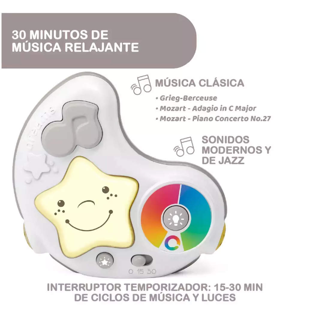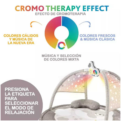 - Música relajante y cromoterapia: 30 minutos de música relajante y proyecciones de luz a elegir de entre 3 combinaciones: Juego y diversión, Relajación, o Entretenimiento