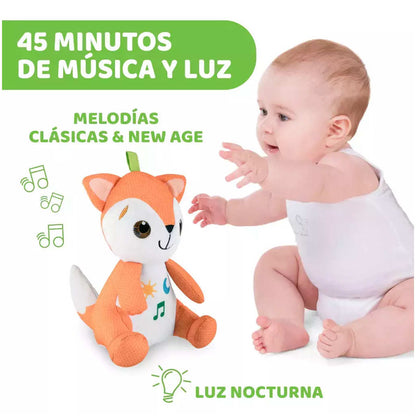 - Zorro de peluche: un suave zorro de peluche interactivo hace compañía al bebé tanto colgado como por separado; al presionar los botones de su barriga, se activan luces, melodías y nanas