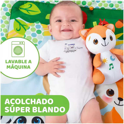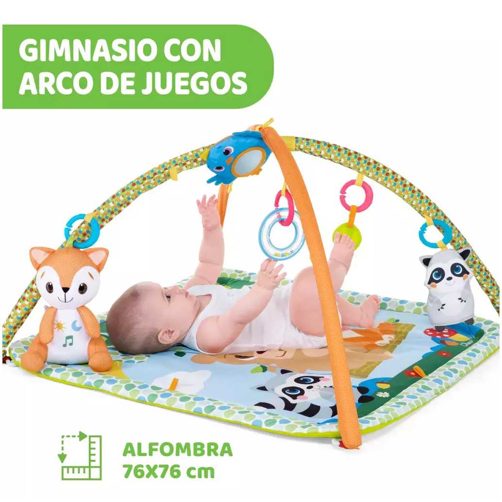 - Gimnasio de actividades Chicco: la alfombra infantil Chicco Descansa y juega, con música y luces, consta de una blandita manta de juegos para bebés con arcos y 5 divertidos muñecos colgantes, incluido un zorro de peluche electrónico