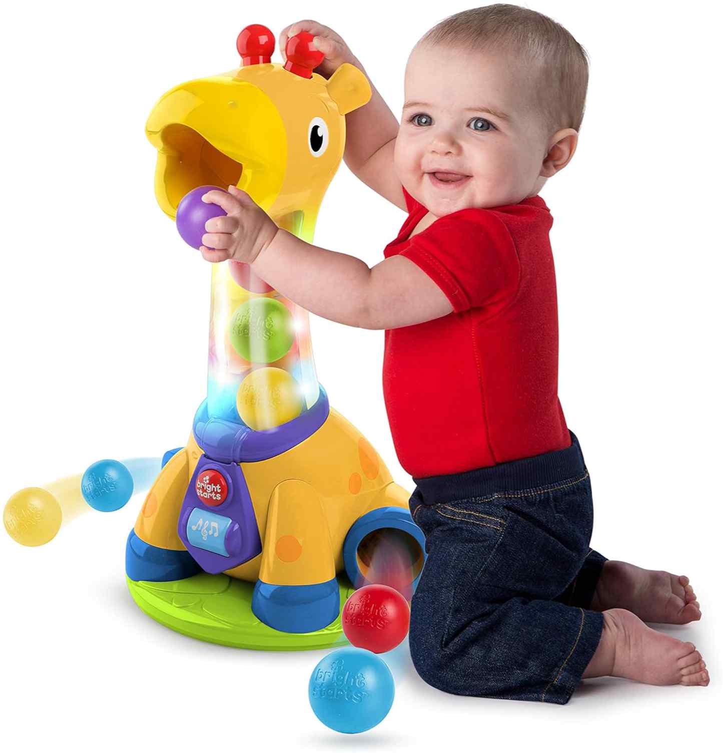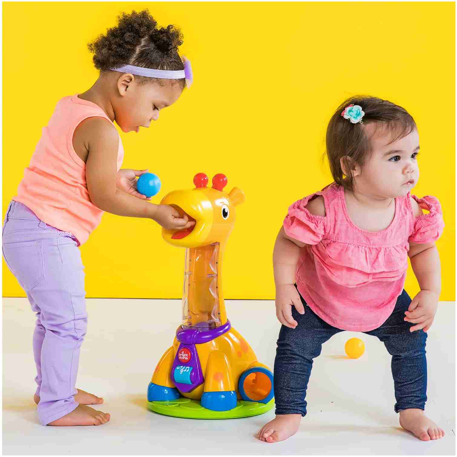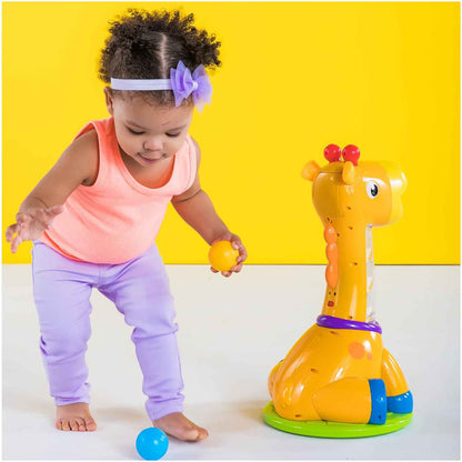 ¡Spin & Giggle Giraffe de Bright Starts se mueve en su lugar para hacer más divertido el buscar las pelotas!