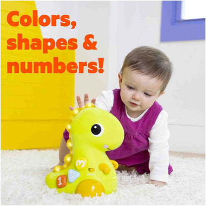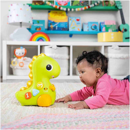 "¡Guau!" A tu bebé le encantará ver corretear por casa este dinosaurio musical con luces. Con música, luz, movimiento y simpáticos sonidos que se activan con tan solo un toque en su nariz. Podrá divertirse jugando con él a contar, con tan solo pulsar un botón. Deja el dinosaurio fijo en un lugar y así podrá jugar con él cualquier bebé que aún no haya aprendido a gatear. ¡La diversión que le proporcionará este juguete hará que le encanta moverse!