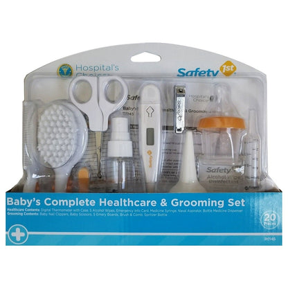 El kit completo de cuidado y aseo para bebés Safety 1st Baby's Complete Healthcare & Grooming Set incluye artículos esenciales de cuidado y aseo que no deberían faltar en ninguna habitación infantil, como un termómetro digital, un dispensador de medicamentos, un cortauñas, un cepillo para el cabello y un peine. El kit también incluye otros artículos para ayudarte con las necesidades de cuidado y aseo de tu bebé. Ya sea que los guardes en la habitación infantil o los guardes en la bolsa de pañales para usarlos mientras viajas, estarás preparada para brindarle a tu bebé el mejor cuidado.