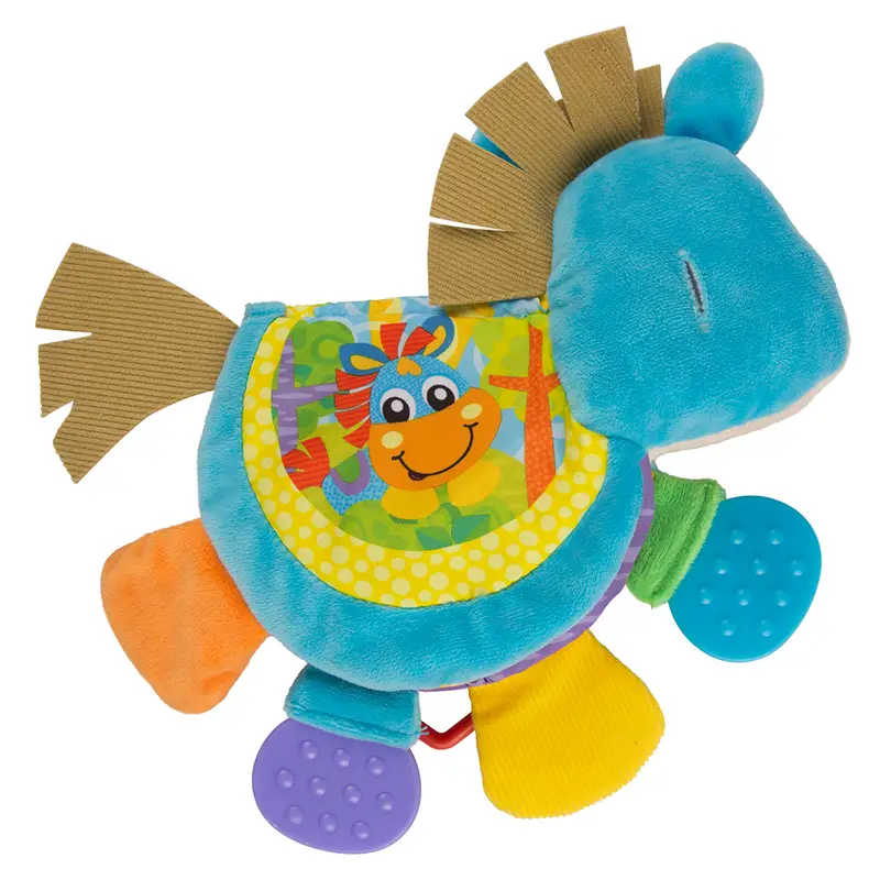 Libre de BPA, PVC y Ftalatos, el Libro Mordedor Musical Clip Clop de Playgro promueve el estímulo de los sentidos de tu pequeño a través, del tacto y la audición.