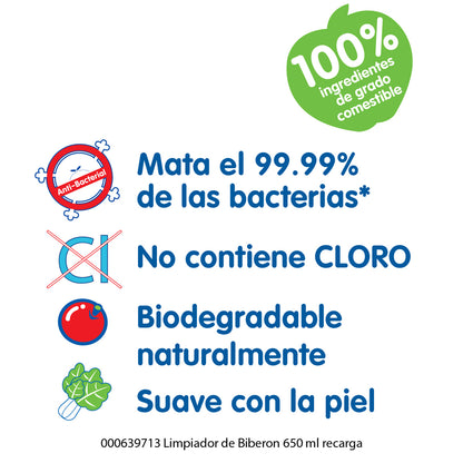 El limpiador de mamaderas Pigeon mata el 99.99% de las bacterias. (*Elimina las bacterias: Staphylococcus aureus, pseudomonas aeruginosa).