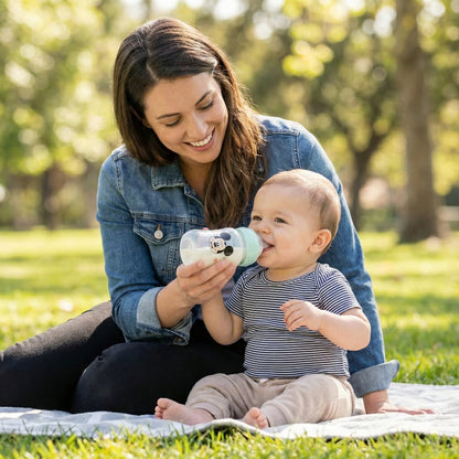 - Tetina ajustable de 3 posiciones: Regula el flujo de líquido según la succión del bebé, desde tomas más lentas hasta más rápidas.