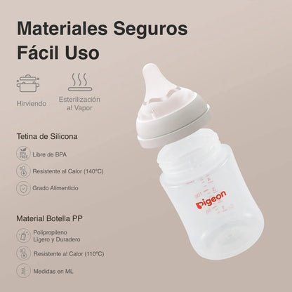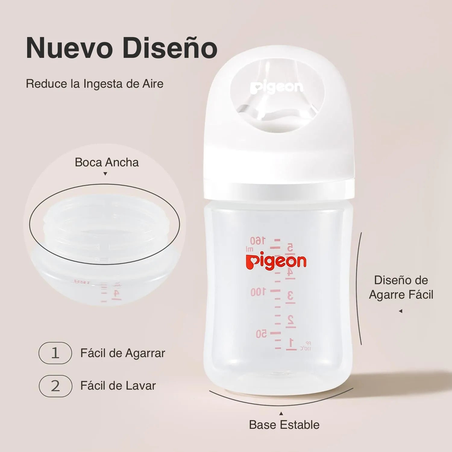La Mamadera Boca Ancha SofTouch PIGEON PP de 160 ml es ideal para los bebés, ya que su diseño de boquilla ancha permite un mayor flujo de leche y evita la formación de gases. Fabricada con materiales libres de BPA, garantiza la seguridad de tu pequeño mientras se alimenta. ¡Con la mejor calidad de PIGEON para tu bebé!