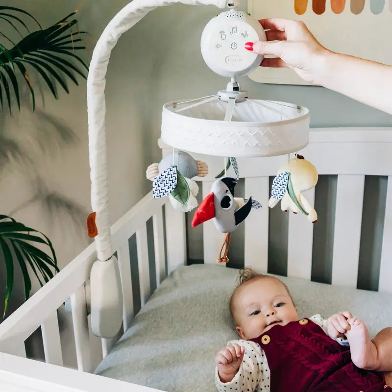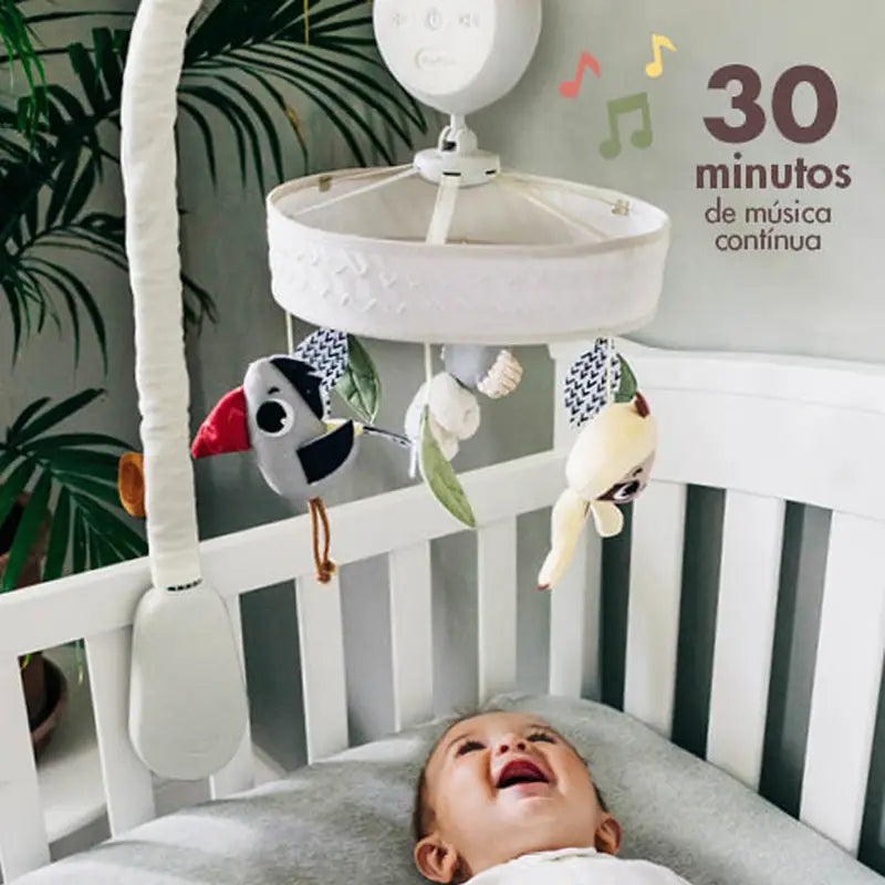 A diferencia de cualquier otro móvil de decoración, el Móvil Musical Boho Chic Luxe de Tiny Love es el único que ofrece una variedad de funciones electrónicas. Por un lado, un sonido de silencio único, ¡que no creerás lo rápido que enviará a tu bebé a un mundo de sueños!, sonidos de la naturaleza y 17 relajantes melodías que reproducen hasta 30 minutos de música continua.