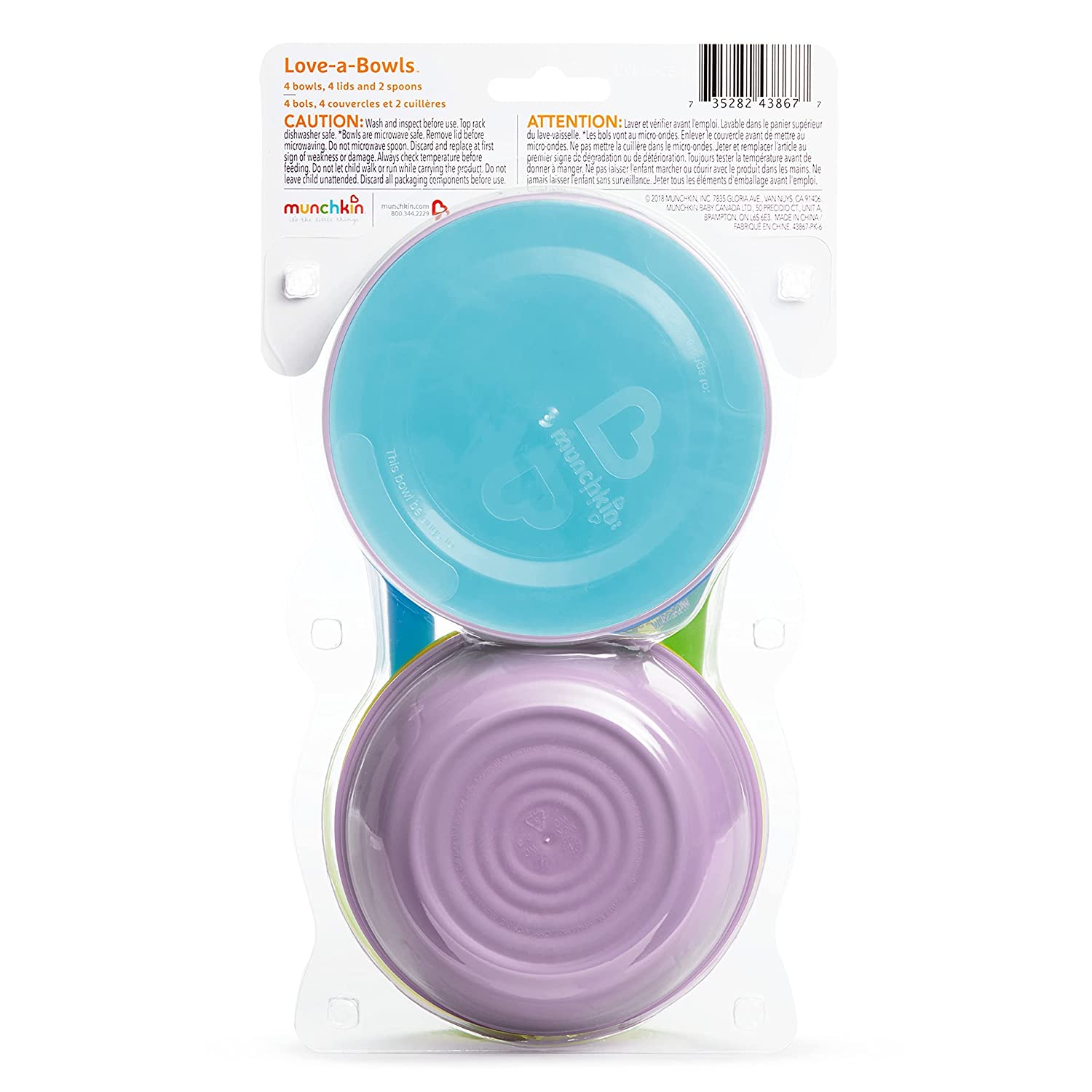 Cuando los bebés se gradúan de mamaderas a sólidos, parece que nunca hay suficientes bowls para adaptarse a sus necesidades de crecimiento. Al menos, hasta ahora. Los recipientes Love-a-Bowls de Munchkin son 100% a prueba de fugas y roturas. Ten la seguridad de que también son seguros para usar prácticamente en cualquier lugar, incluyendo tu microondas, congelador y lavavajillas. Este juego de cuatro bowls intercambiables viene con cuatro tapas y dos cucharas de punta suave, por lo que es el principiante perfecto para los primeros días de alimentación sólida. Perfecto para todo, desde comida para bebés hasta aperitivos para niños, estos cuencos son fáciles de almacenar y fáciles de llevar para las madres ocupadas sobre la marcha. Y cuando llega el momento de guardarlos, se apilan perfectamente para un fácil almacenamiento. Apila y abastécete de este brillante juego de alimentación: los cuencos y cucharas seguramente ganarán un lugar permanente en tu cocina (y tu corazón).