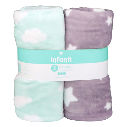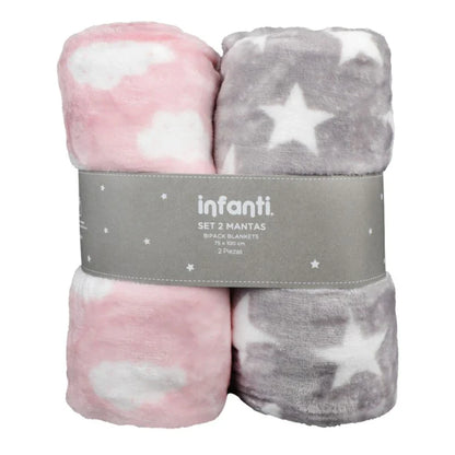El pack de 2 mantas INFANTI ofrece la combinación perfecta de confort y diseño para tu bebé. Cada manta está confeccionada en 100% poliéster, garantizando una textura suave y cálida, ideal para envolver a tu pequeño en momentos de descanso o durante sus paseos.