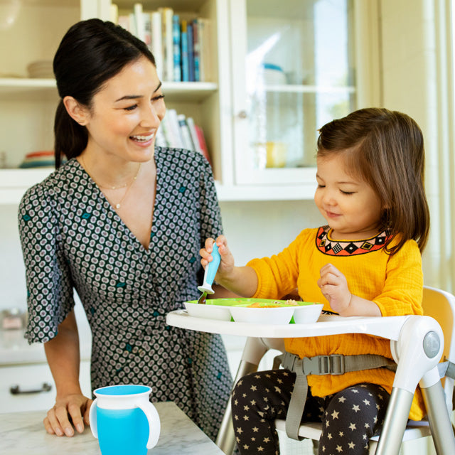 ¡Mantén la cuchara de tu pequeño siempre libre de contacto con la mesa y otras superficies!