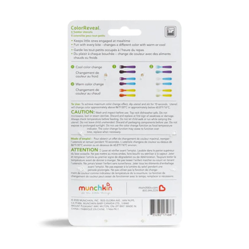 El Set de Tenedor y Cucharas Munchkin que cambian de color es un conjunto de utensilios de alimentación diseñado para hacer que la hora de la comida sea más divertida y educativa para los niños. Este set incluye 6 piezas: 3 tenedores y 3 cucharas, todas con puntas que reaccionan al calor o al frío de los alimentos, cambiando de color para indicar si la comida está demasiado caliente o fría para el consumo. Este cambio de color ayuda a los padres a asegurarse de que la comida esté a una temperatura segura para su hijo.