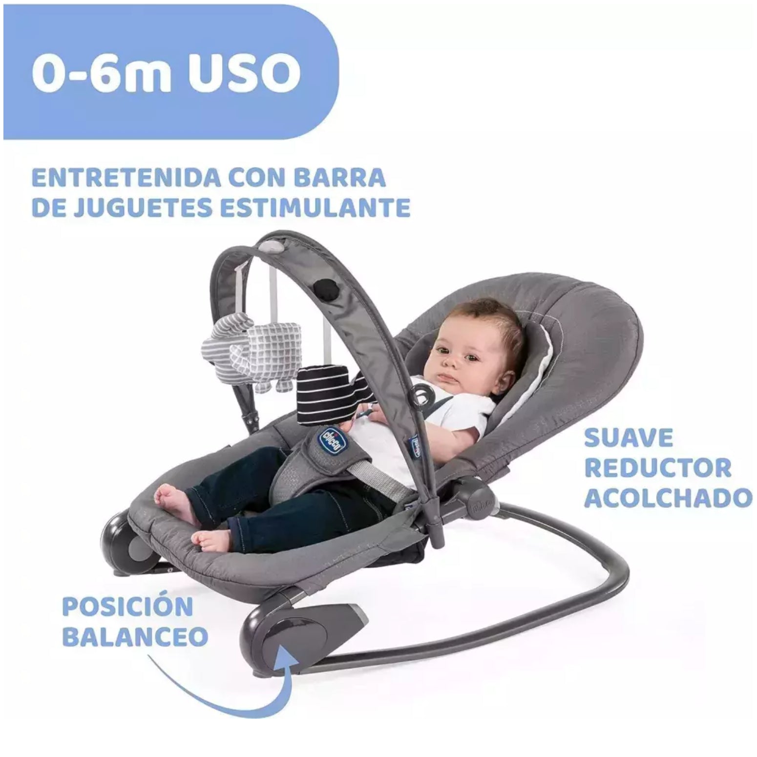 - Ajustable: la silla hamaca Chicco Hooplà está equipada con un cojín reductor suave, desmontable y lavable, que envuelve suavemente al bebé. Se puede usar en una posición fija o como una mecedora