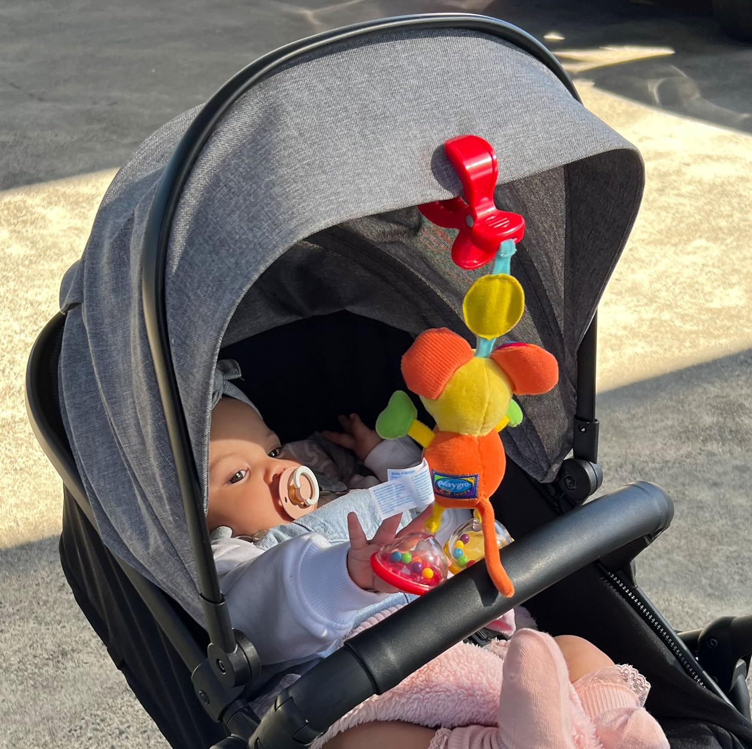 - Pinza grande para fácil colocación en la cuna, silla de paseo o cochecito.