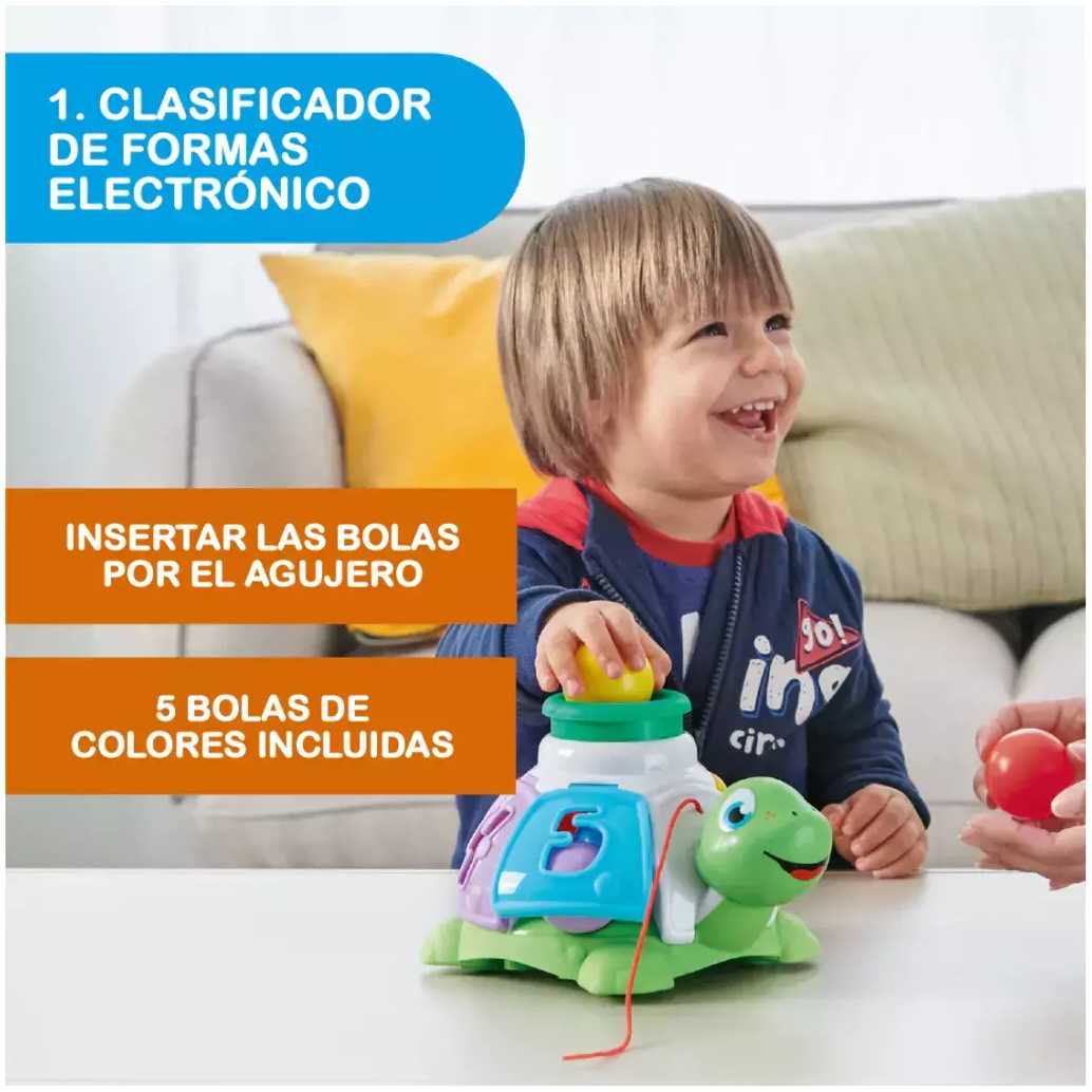 - Bolas para clasificar formas: El pequeño puede meter las 5 bolas de colores en la ranura naranja del caparazón de la tortuga