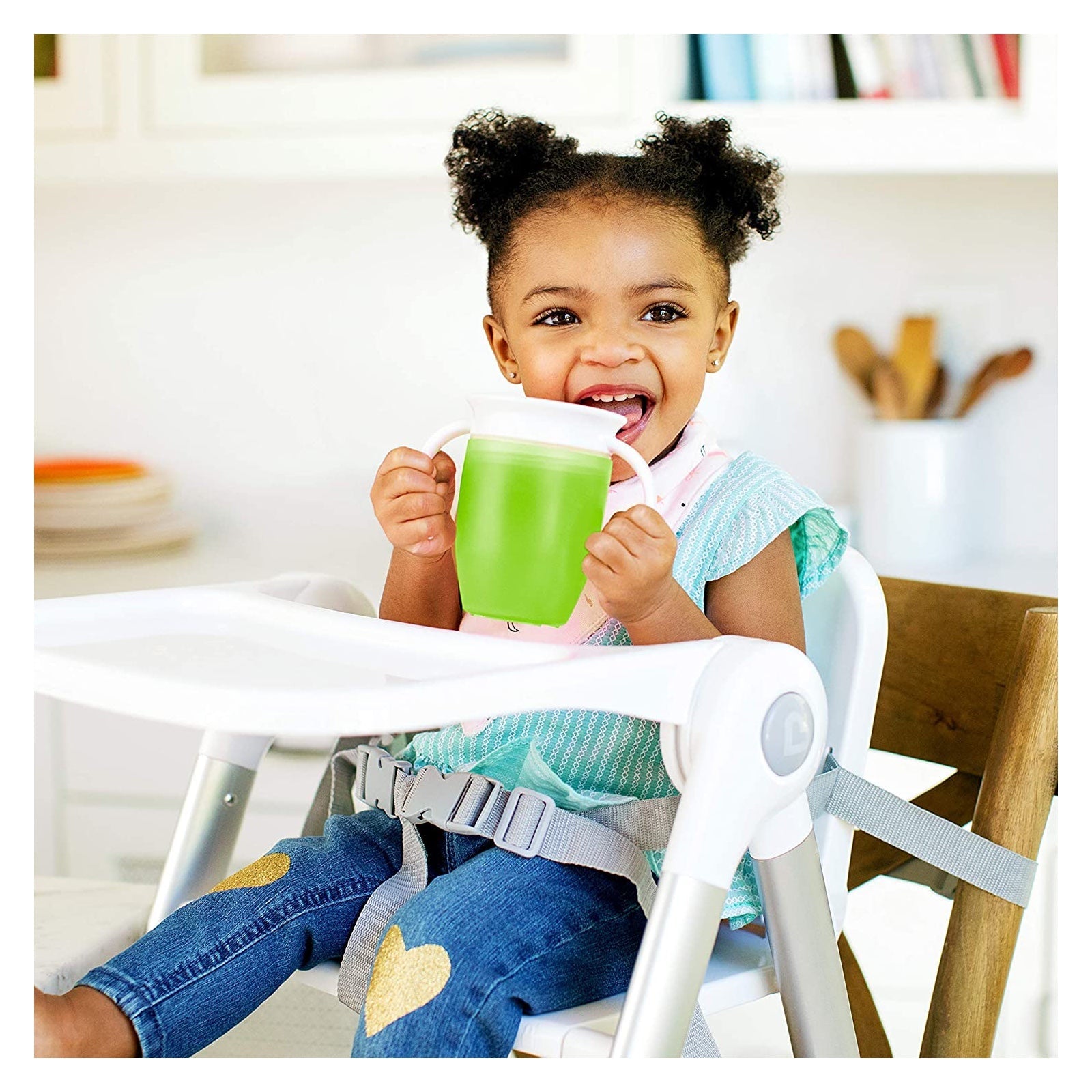 Los niños se ponen perdidos, sobre todo cuando empiezan a beber en vaso. Ahora imagínate un mundo en el que las bebidas nunca se derraman, ni en el bolso de los pañales, ni en la mesita de noche, ni siquiera encima de tu hijo con todas esas ganas de aprender que tiene. No, no es un milagro exactamente, sino el vaso antiderrames con asas Miracle 360° de Munchkin. El vaso antiderrames Miracle 360° de Munchkin es el primer vaso infantil inventado pensando tanto en los niños como en los papás, que elimina los derrames y cuida de la salud de los dientes. Al poder beber por cualquier parte del borde, como en un vaso normal, contribuye al correcto desarrollo de los músculos bucales. Y como no tiene pitorros, pajitas ni piezas extra, el vaso antiderrames Miracle 360° es fácil de usar e incluso más fácil de limpiar. ¡A tu salud!